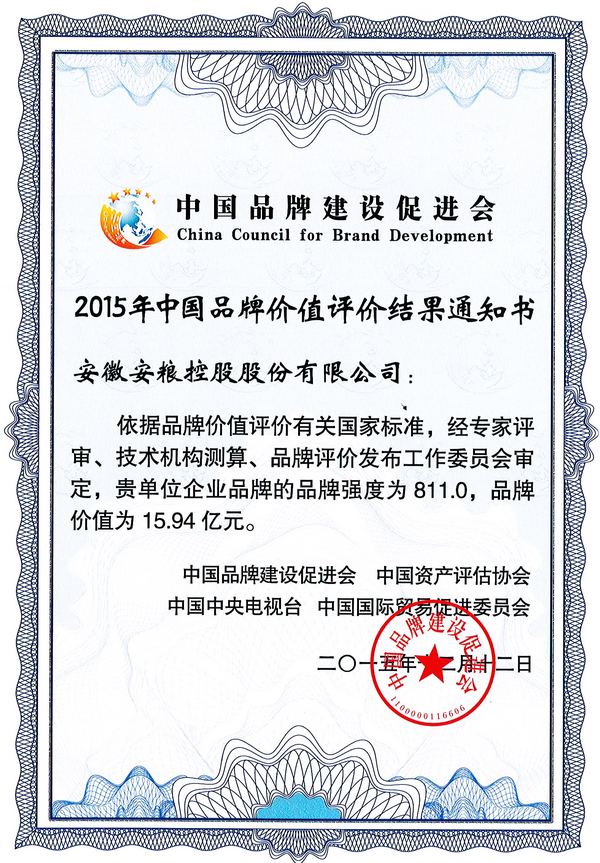 12月12日,由中國(guó)品牌建設(shè)促進(jìn)會(huì)、中央電視臺(tái)、中國(guó)資產(chǎn)評(píng)估協(xié)會(huì)、中國(guó)國(guó)際貿(mào)促會(huì)等聯(lián)合舉辦的“2015年中國(guó)品牌價(jià)值評(píng)價(jià)信息發(fā)布暨2015中國(guó)品牌發(fā)展論壇”在北京舉行。經(jīng)公司統(tǒng)一組織申報(bào),“安糧”作為企業(yè)品牌榮登榜單,品牌價(jià)值15.94億元。