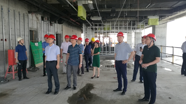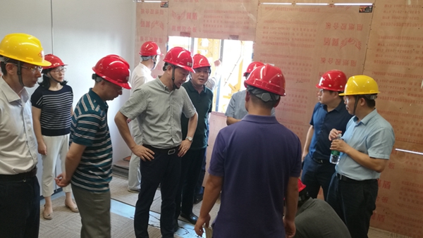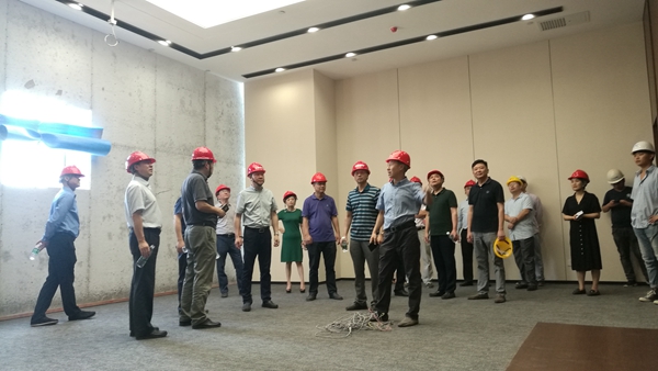 曹訓(xùn)立董事長一行來到精裝修樣板層,參觀了獨立式辦公室、開放式辦公區(qū)、會議室等主要區(qū)域,對空調(diào)系統(tǒng)、電梯設(shè)備、墻地面裝飾材料等進行了細致了解,并對會議中心提出了具體要求。