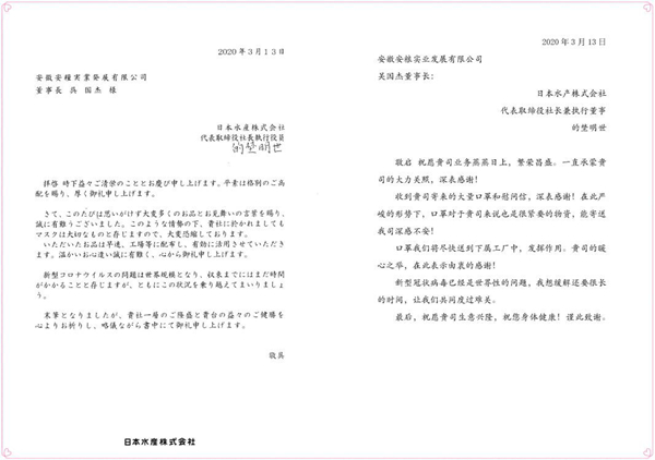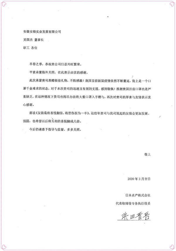 近日,日本水產(chǎn)株式會社的感謝信從東京寄到安糧實業(yè),用以表達(dá)對安糧實業(yè)捐助其10000只口罩的衷心感謝。