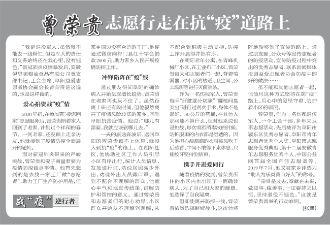 黃山人曾榮貴是安徽伊思頓糧油食品有限公司黨支部書記,他是一名傷殘退伍軍人,擔(dān)任阜陽(yáng)益愛(ài)志愿者協(xié)會(huì)副會(huì)長(zhǎng),曾積極參與過(guò)大小百余次公益活動(dòng),被評(píng)選為“助人為樂(lè)黃山好人”稱號(hào)。在今年新冠病毒蔓延的特殊時(shí)期,曾榮貴不僅捐資戰(zhàn)“疫”,更沖鋒在前。正月初一,他就協(xié)同當(dāng)?shù)卮鍍晌e極投入到防控疫情一線,白天走進(jìn)村委會(huì)和公共場(chǎng)所開(kāi)展防疫消毒,幫助村兩委工作人員開(kāi)展出入人員管控;晚上編輯公眾號(hào)文章,宣傳防疫活動(dòng)和防疫過(guò)程中的好做法,用行動(dòng)踐行了共產(chǎn)黨員的初心使命,發(fā)揮了黨員的先鋒模范作用。