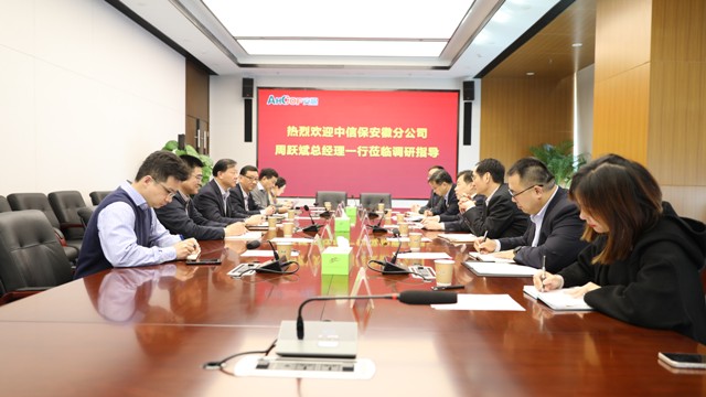 3月3日下午,中信保安徽分公司黨委書記、總經(jīng)理周躍斌帶隊(duì)來公司調(diào)研,曹訓(xùn)立董事長熱情接待了周躍斌總經(jīng)理一行并舉行調(diào)研座談,周洪、吳國杰、朱亮及相關(guān)部門負(fù)責(zé)人參加座談會(huì)。