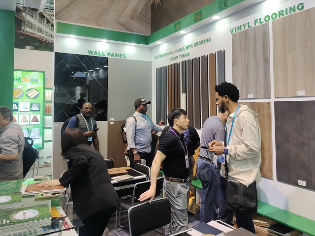建材展位重點推出了墻板,格柵,樓梯踏板以及木塑戶外地板等新產(chǎn)品,從室內(nèi)到戶外產(chǎn)品一應(yīng)俱全。參展部門根據(jù)對去年秋季交易會的考察分析以及近期客戶最新詢盤情況的整合梳理,積極開拓更新參展產(chǎn)品。結(jié)合國外最新流行的趨勢,推出了拼花木紋,石紋等當(dāng)下十分暢銷的花色。利用立體燈箱,將產(chǎn)品優(yōu)勢,產(chǎn)品結(jié)構(gòu)剖面等信息直觀展示,讓客戶更加清晰地了解產(chǎn)品的性能和優(yōu)點,吸引諸多專業(yè)買家的觀看和洽談。此外,在攤位新增產(chǎn)品拼裝的體驗區(qū),增加產(chǎn)品小樣及配件的DIY拼裝,吸引客戶自己動手,大大提升了參與度和體驗感,讓客戶真切地感受到安糧的誠意與新意。