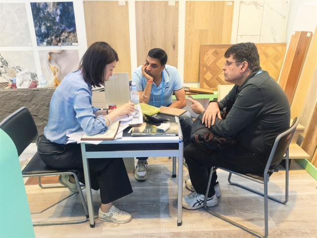 建材展區(qū)中,安糧以差異化策略布局全球市場(chǎng)。UV亮面墻板采用卡扣式快裝結(jié)構(gòu),安裝便捷、節(jié)省工時(shí),深受東南亞客商青睞;為南美、中東定制的3D打印花色與鎏金花紋墻板,支持紋樣和尺寸個(gè)性化定制,滿足高端空間的獨(dú)特審美。