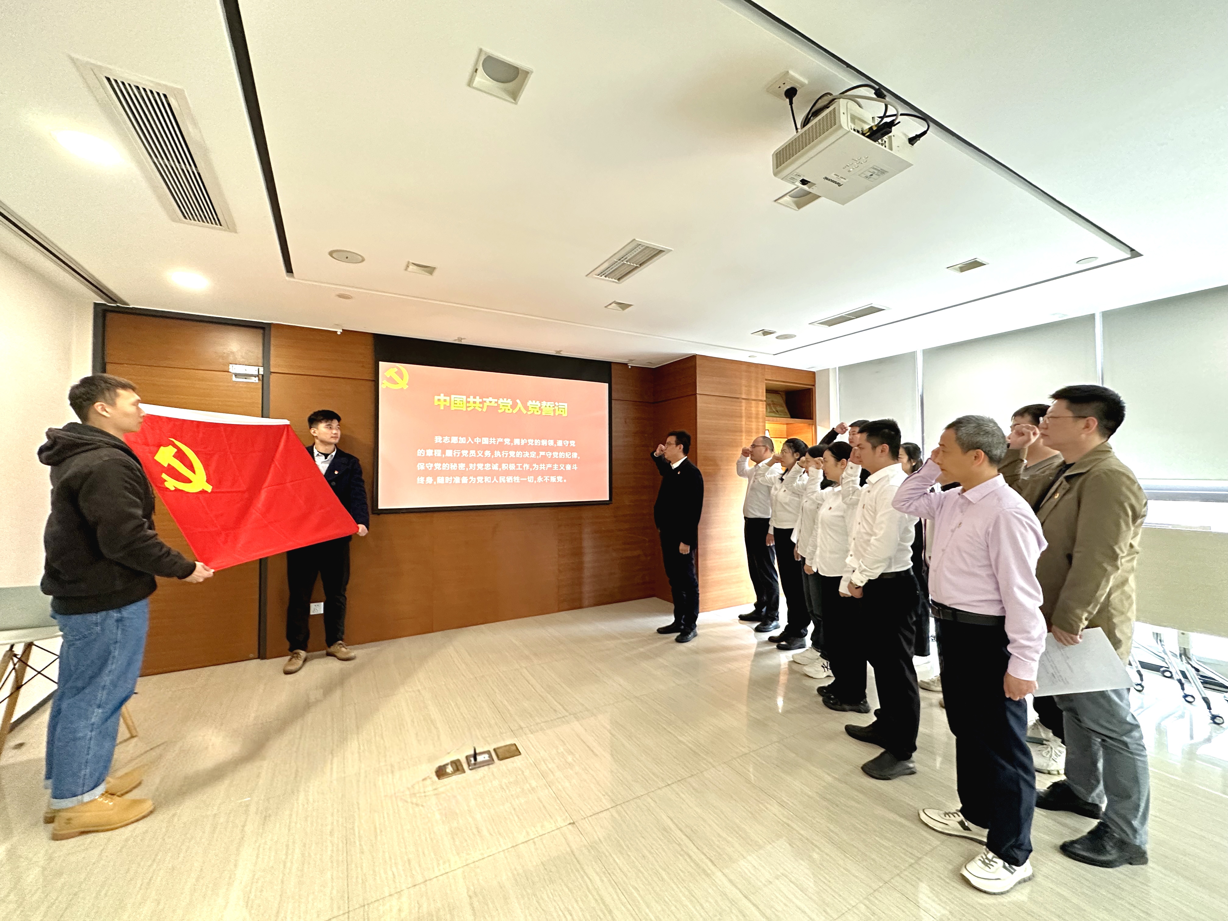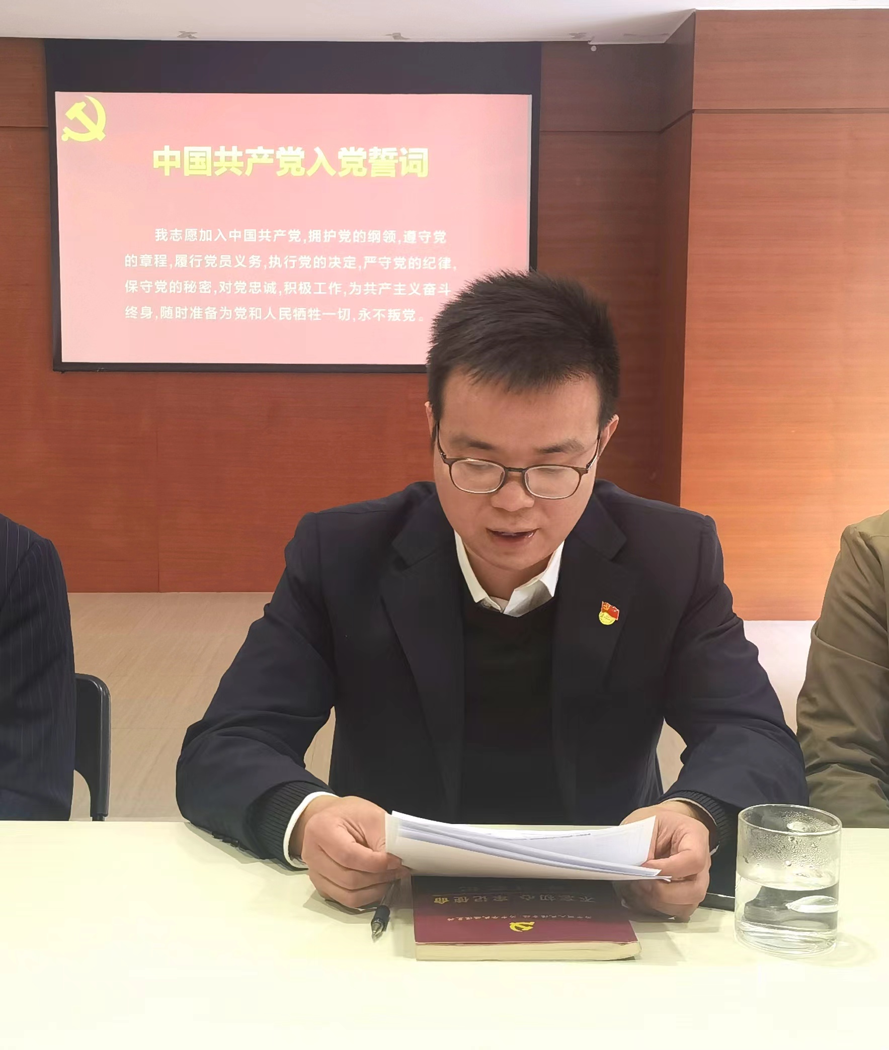 (新黨員入黨宣誓儀式) 宣誓儀式在激昂高亢的《國際歌》中拉開帷幕。5名新黨員戴上黨徽,在黨支部副書記的帶領下,面向黨旗,右手舉拳,莊嚴宣誓:“我志愿加入中國共產(chǎn)黨,擁護黨的綱領,遵守黨的章程……”字字鏗鏘,句句千鈞。 黨支部副書記邱昂瑞對新黨員表示祝賀,希望同志們終身牢記自己在黨旗下所立的誓言,用實際行動踐行自己的誓言,充分發(fā)揮共產(chǎn)黨員先鋒模范帶頭作用。新黨員代表張舒表示將會把入黨誓詞作為自己終身的追求,不辜負黨的期望,不辜負共產(chǎn)黨員這個光榮的稱號。