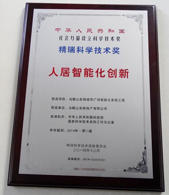 全聯(lián)房地產(chǎn)商會(原全國工商聯(lián)房地產(chǎn)商會)2014年度年會于2014年12月13-14日在北京召開,第11屆精瑞獎頒獎典禮同期舉行。我司“馬鞍山安糧城市廣場智能化系統(tǒng)工程”榮獲第11屆領(lǐng)先技術(shù)產(chǎn)品類精瑞獎。